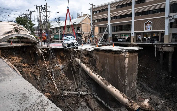 Xe bị kéo ra khỏi mép hố sau khi đường sụt gần một bệnh viện ở Bangkok ngày 24/9/2025 (Ảnh: AFP)