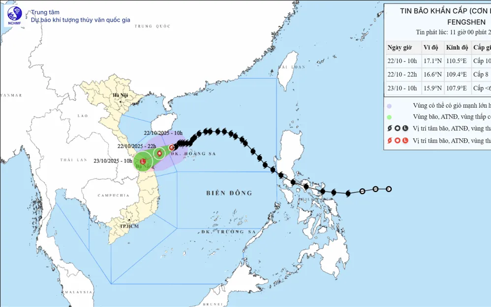 Do ảnh hưởng của hoàn lưu bão và không khí lạnh, kết hợp với một số hình thế thời tiết khác, từ đêm nay (22/10) đến ngày 27/10, khu vực Trung Trung Bộ có khả năng xảy ra đợt mưa lớn trên diện rộng, kéo dài nhiều ngày, cục bộ có nơi mưa rất to trên 800mm. Mưa lớn, thủy triều, nước dâng cao, nguy cơ cao xảy ra ngập úng nghiêm trọng ở các đô thị và vùng trũng thấp, lũ ống, lũ quét, sạt lở đất ở vùng núi; lũ lớn trên các sông từ Quảng Trị đến Quảng Ngãi.