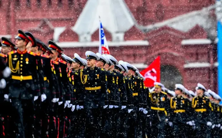 Binh lính Nga tham gia lễ duyệt binh Ngày Chiến thắng lần thứ 79 tại Quảng trường Đỏ ở Moscow, ngày 9/5/2024 (Ảnh: Anadolu)