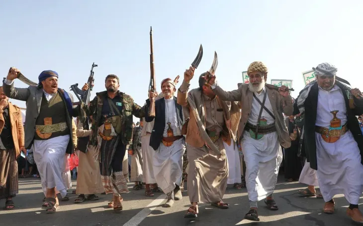 Những người ủng hộ Houthi tại Sanaa, Yemen nhảy múa ăn mừng về thỏa thuận ngừng bắn Israel - Hamas hôm 10/10/2025 (Ảnh: AP)