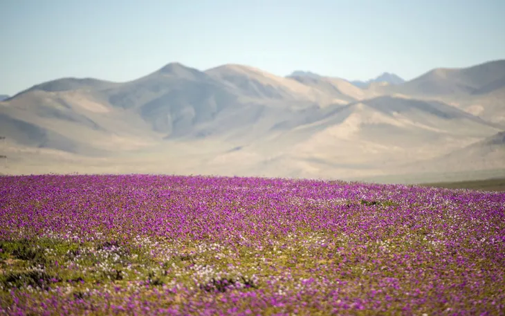 Thảm hoa năm nay chủ yếu mang sắc hồng và tím, nhưng cũng điểm xuyết vàng, đỏ, xanh lam và trắng, tạo nên khung cảnh huyền ảo hiếm thấy. Hàng nghìn du khách đã đổ về công viên quốc gia Llanos de Challe, cách thủ đô Santiago khoảng 800 km, để chiêm ngưỡng "mùa xuân ngắn ngủi" giữa sa mạc.
