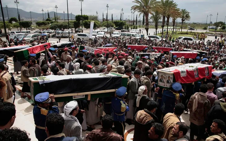 Người dân Yemen khiêng quan tài 31 nhà báo thiệt mạng trong lễ tang tại Sana’a ngày 16/9/2025 (Ảnh: AP)