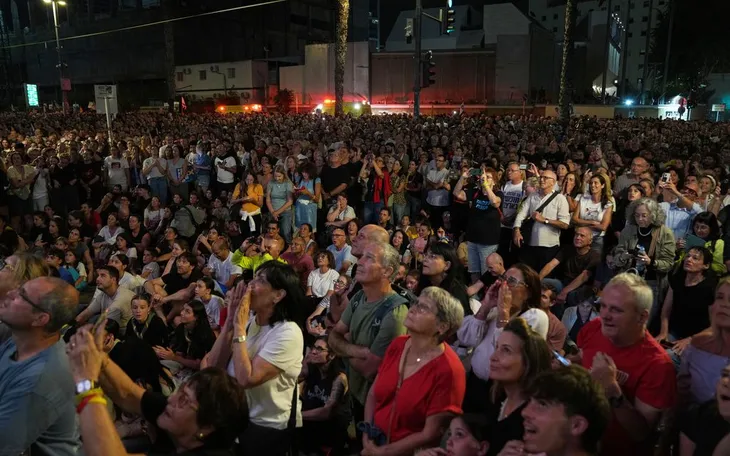 Người dân tham gia cuộc mít tinh ủng hộ con tin bị Hamas bắt giữ tại Quảng trường Con tin ở Tel Aviv, Israel, ngày 11/10/2025, trước khi việc trao trả con tin bắt đầu. (Ảnh: AP)