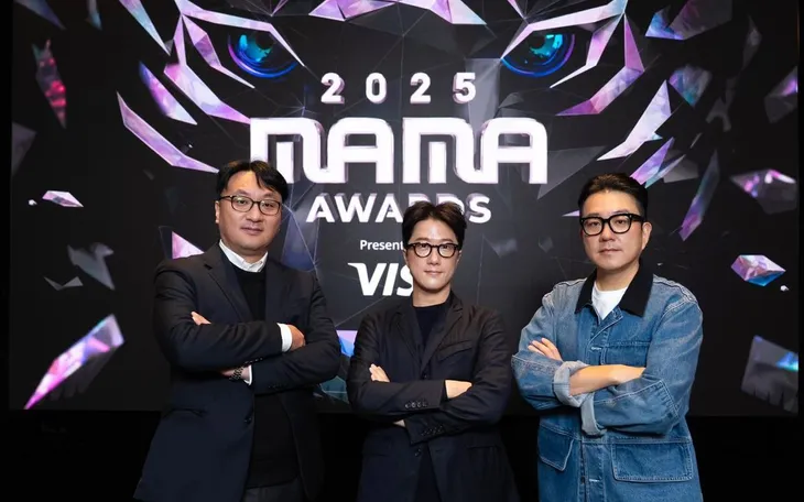 (Từ trái sang) Park Chan-uk, người đứng đầu bộ phận giải trí trực tiếp tại bộ phận nội dung âm nhạc của CJ ENM, và các nhà sản xuất của Mnet là Ma Du-sik và Lee Young-joo tạo dáng trong sự kiện báo chí cho Lễ trao giải MAMA 2025. (Ảnh: CJ ENM)