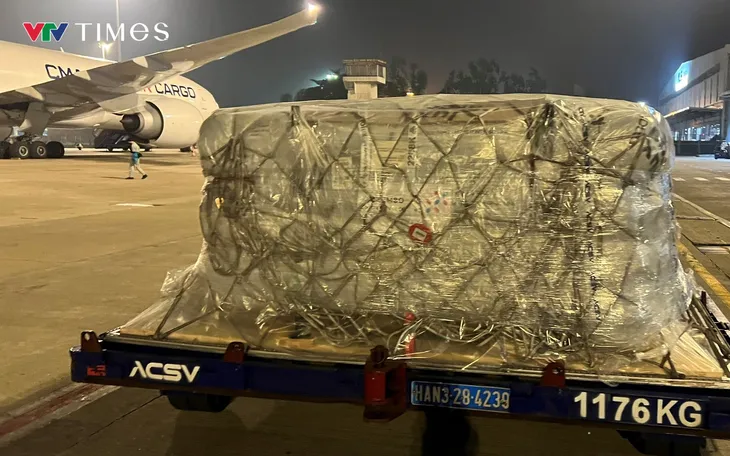 Hàng viện trợ được vận chuyển từ Luxembourg, hạ cánh tại sân bay quốc tế Nội Bài. Ảnh: Thái Thọ