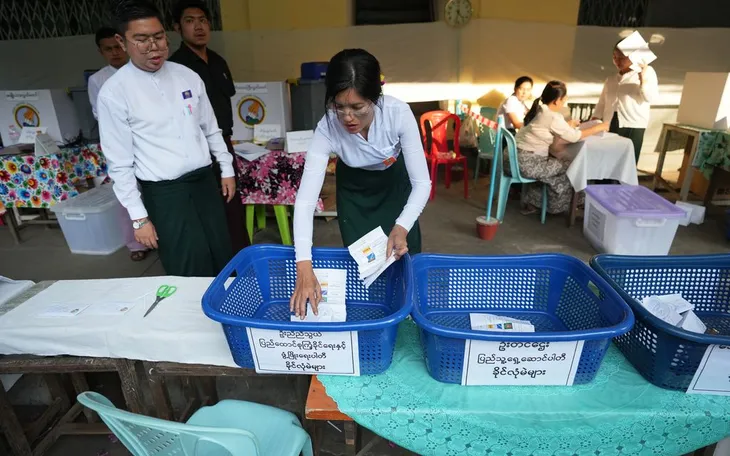 Một cán bộ Ủy ban Bầu cử Liên bang kiểm phiếu tại điểm bỏ phiếu trong vòng cuối của cuộc tổng tuyển cử ở Yangon, Myanmar, ngày 25/1/2026 (Ảnh: AP/Thein Zaw)