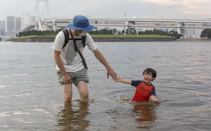 Em bé chơi đùa cùng bố trên bãi biển Odaiba ở Tokyo hôm 17/8 (Ảnh: AFP)
