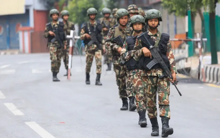 Binh sĩ quân đội Nepal đứng gác trên đường phố thủ đô Kathmandu ngày 10/9 (Ảnh: AFP)