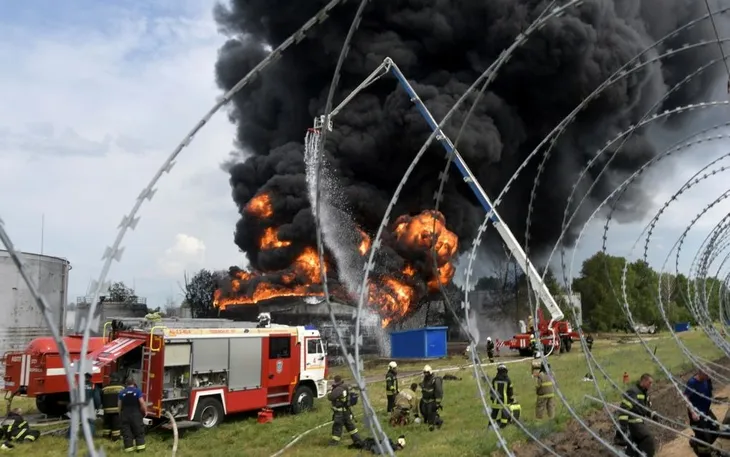 Lính cứu hỏa xử lý đám cháy tại kho nhiên liệu ở Voronezh, Nga (Ảnh: AP)