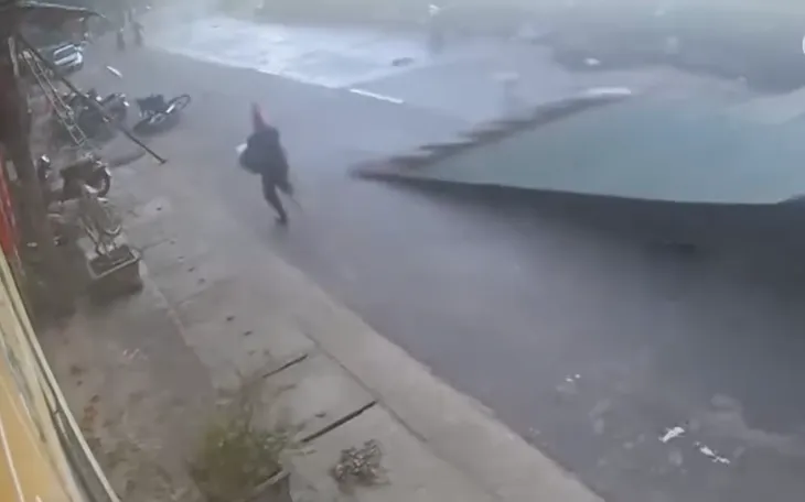 Cả giàn tôn bị gió hất văng ra đường ở xã Vạn An khiến nhiều người hoảng loạn tháo chạy. Ảnh CTV.
