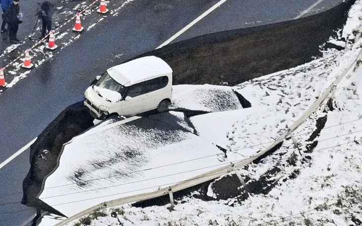 Một đoạn đường bị hư hại ở thị trấn Tohoku, tỉnh Aomori, miền Bắc Nhật Bản sau trận động đất mạnh xảy ra vào tối 8/12/2025 (Ảnh: AP)