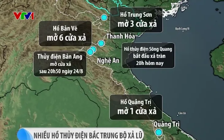 Trước đó, hồ Bản Vẽ của Nghệ An cũng đã tiến hành mở 6 cửa xả, hồ Trung Sơn ở Thanh Hóa mở 3 cửa xả. Hồ Quảng Trị tỉnh Quảng Trị mở 1 cửa.