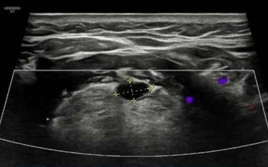 Qua thăm khám, bác sĩ chỉ định siêu âm tuyến giáp và chụp cắt lớp vi tính phổi liều thấp. Kết quả siêu âm ghi nhận hình ảnh dạng nang ít cản âm, giúp loại trừ khả năng tuyến giáp lạc chỗ dạng đặc. Đây là dấu hiệu quan trọng định hướng chẩn đoán chính xác: bệnh nhân mắc dị tật bẩm sinh nang ống giáp lưỡi.