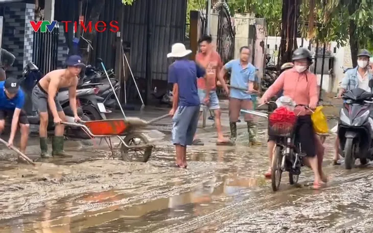 Tại khu vực chợ Hội An, lớp bùn đặc quánh bám đầy trên mặt đường, người dân hối hả dùng xẻng, chổi cào để dọn từng đoạn phố, nhiều người vất vả dắt xe qua bãi sình lầy.
