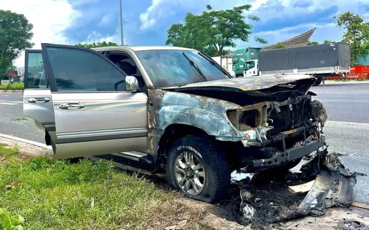 Tại hiện trường, phần đầu xe 7 chỗ cháy rụi, trơ khung, nhiều mảnh vỏ nhựa rơi xuống đường. Ttrong khi khoang lái và thân xe còn nguyên vẹn.