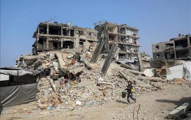 Những tòa nhà bị phá hủy do xung đột tại Dải Gaza (Ảnh: THX/TTXVN)