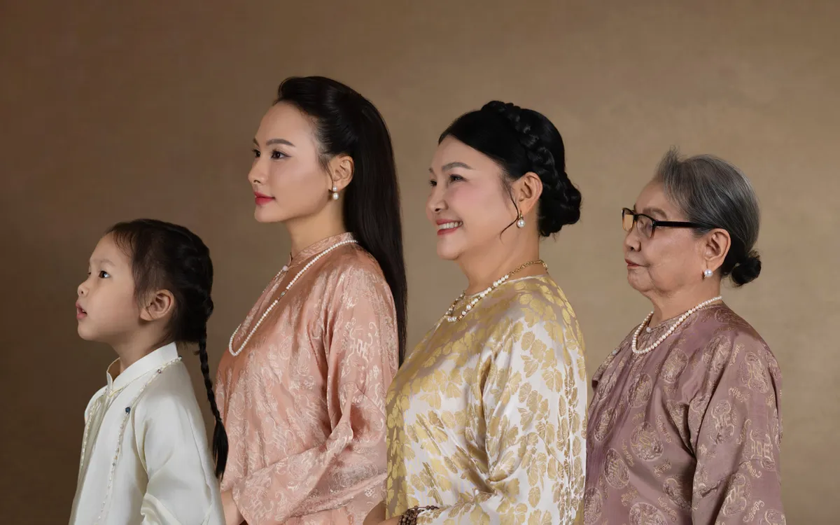 4 thế hệ lựa chọn những tà áo dài lụa mềm mại, duyên dáng để hóa thân thành những người phụ nữ nền nã, hay hóa thân vào bộ tranh tứ bình tố nữ dân gian Hàng Trống, tôn vinh những giá trị văn hóa truyền thống Việt Nam.