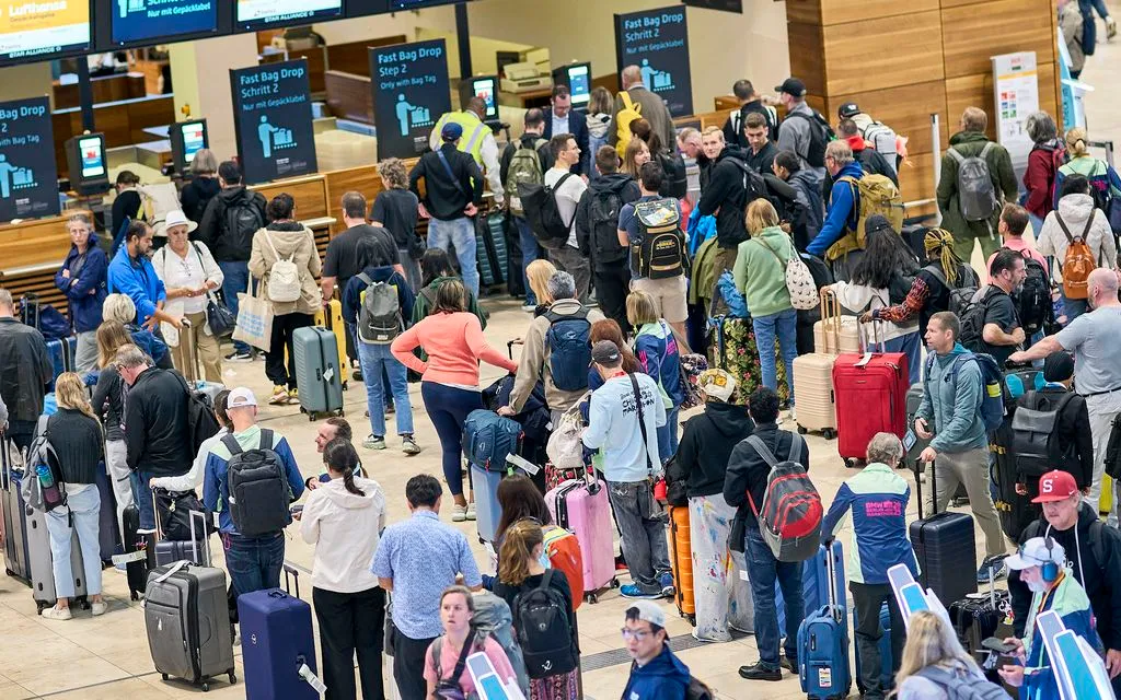 Hành khách xếp hàng tại quầy check-in ở sân bay Berlin Brandenburg, Đức sau vụ tấn công mạng ngày 22/9/2025 (Ảnh: AP)