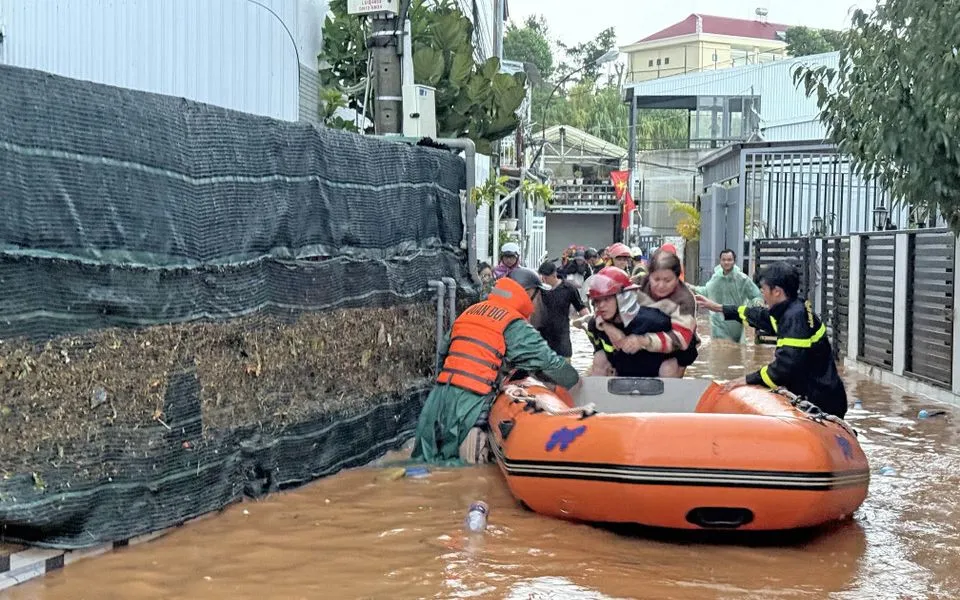 Lực lượng chức năng đưa người ra khỏi các căn nhà ven suối tại khu vực đường Lữ Gia (phường Lâm Viên – Đà Lạt) bị ngập sâu sau trận mưa lớn chiều 12/8. (Ảnh: TTXVN)