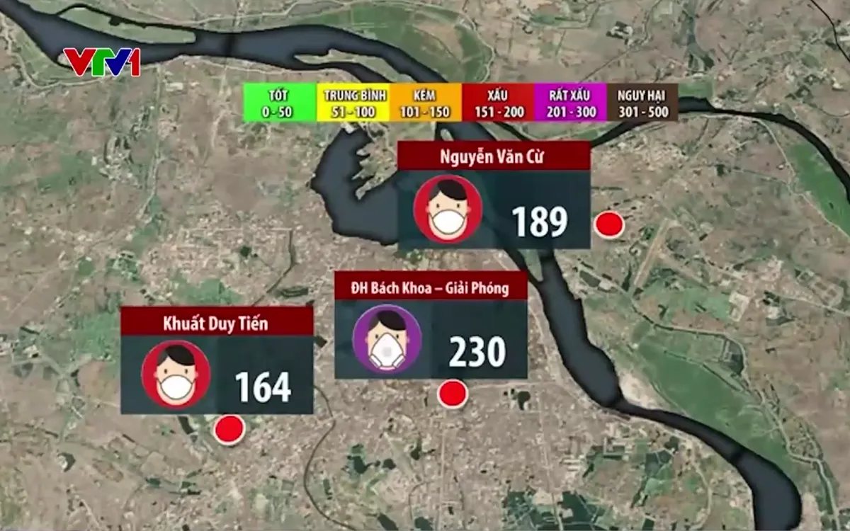 Theo hệ thống quan trắc của Cục Môi trường, lúc 10h sáng, chỉ số chất lượng không khí (AQI) tại trạm đo cổng Đại học Bách khoa Hà Nội (đường Giải Phóng) ở mức 230 – mức rất kém. Đây là ngày thứ ba liên tiếp trạm này ở ngưỡng cảnh báo cao. Hai trạm quan trắc tại Nguyễn Văn Cừ và công viên Khuất Duy Tiến cũng ghi nhận chất lượng không khí ở mức xấu với AQI lần lượt là 189 và 164.