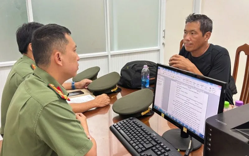 Cán bộ Phòng Quản lý xuất nhập cảnh Công an tỉnh Khánh Hòa làm việc với đối tượng Omokeev Ulukbek. (Ảnh: CA)