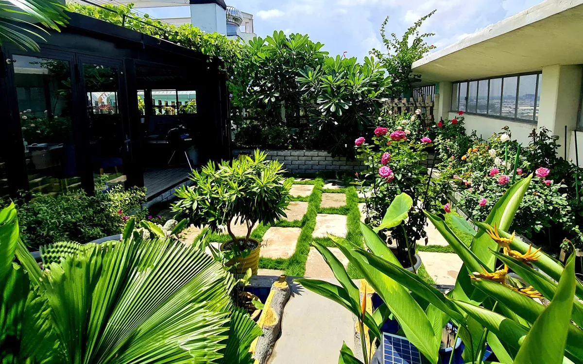 Chị Ngô Phương Nga cùng gia đình sinh sống tại một căn penhouse trên tầng 24 thuộc một khu chung cư ở phường Dĩ An (TP Hồ Chí Minh). Tận dụng phần sân thượng có diện tích hơn 100m2, từ năm 2018, chị đã dày công cải tạo, xây dựng để biến nơi đây thành một khoảng vườn rực rỡ sắc hoa, rau củ, cây trái.