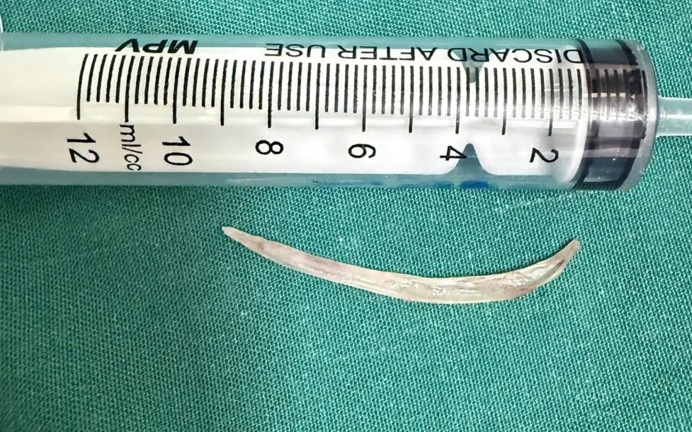 Trường hợp thứ hai là bệnh nhân H.T.T. (47 tuổi, tỉnh Lạng Sơn) nhập viện với triệu chứng đau bụng âm ỉ, sốt cao, bụng trướng. Kết quả chẩn đoán hình ảnh cho thấy dị vật xuyên thủng dạ dày, gây áp xe ổ bụng. Trong ca phẫu thuật, các bác sĩ phát hiện mảnh xương cá hình cánh cung dài khoảng 5 cm xuyên thành dạ dày. Bệnh nhân được xử trí lấy dị vật, làm sạch ổ áp xe, đặt dẫn lưu và khâu phục hồi tổn thương.