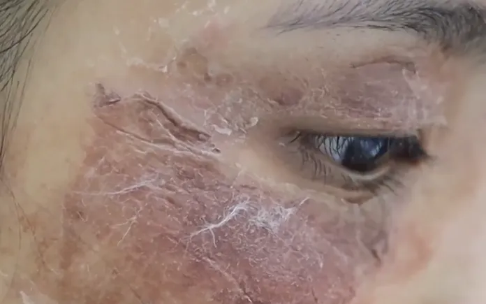 Gương mặt phồng rộp loang lổ là hậu quả nặng nề mà cô gái phải điều trị lâu dài. Bỏ tiền ra mua mỹ phẩm để mong da căng mướt nhưng đẹp đâu chưa thấy mà tiền thì mất còn gương mặt nguy cơ bị để lại sẹo.