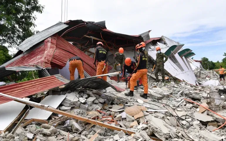 Lực lượng cứu hộ đang tìm kiếm nạn nhân mất tích dưới đống đổ nát của một tòa nhà bị sập do động đất ở thành phố Bogo, Philippines, ngày 1/10/2025 (Ảnh: AFP)