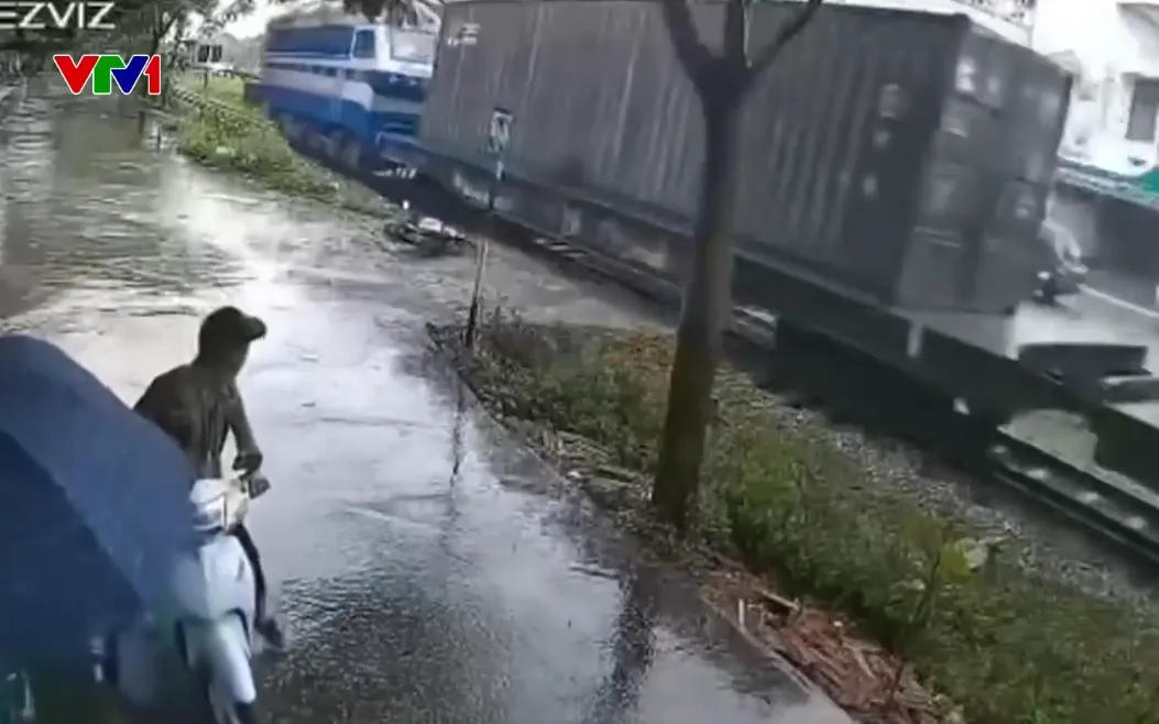 Một phần chủ quan do đường vắng, một phần vì mặc áo mưa nên khó quan sát và không nghe thấy tiếng còi tàu nên 1 người đi xe máy đã băng qua đường sắt.