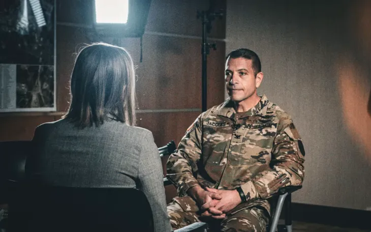 Đại tá Mark Jacques, chỉ huy Trung tâm Y tế Quân đội Darnall đang trò chuyện với phóng viên kênh NBC về vụ bê bối của một bác sĩ quân y (Ảnh: NBC News)