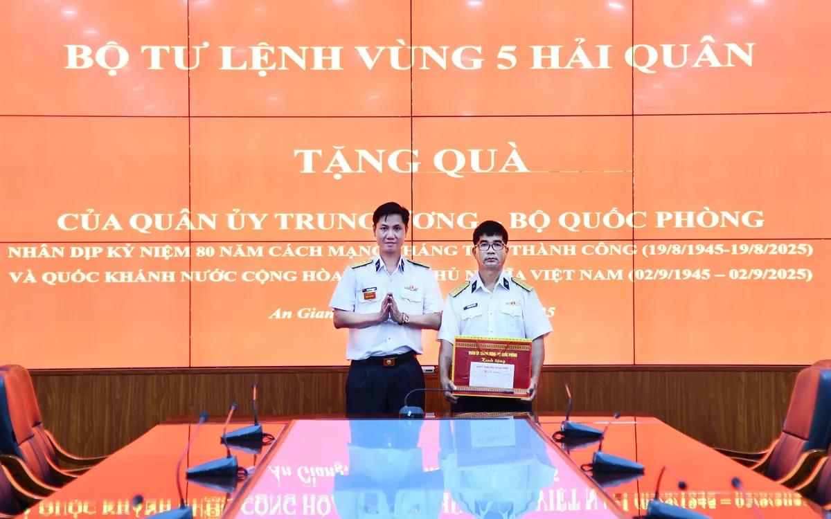 Sáng 1/9, tại Đặc khu Phú Quốc, tỉnh An Giang, Bộ Tư lệnh Vùng 5 Hải quân tổ chức trao quà của Quân ủy Trung ương, Bộ Quốc phòng cho các quân nhân đang điều trị bệnh dài ngày và có hoàn cảnh gia đình đặc biệt khó khăn nhân dịp kỷ niệm 80 năm Cách mạng Tháng Tám thành công và Quốc khánh 2/9. Thượng tá Mai Đăng Danh, Phó Tư lệnh, Tham mưu trưởng Vùng dự và chỉ đạo.