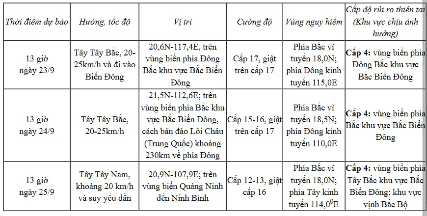 Từ ngày 24/9, khu vực vịnh Bắc Bộ gió mạnh dần lên cấp 6 - 7, sau tăng lên cấp 8 - 10, vùng gần tâm bão đi qua cấp 11 - 13, giật trên cấp 16, sóng biển cao 5,0 - 7,0m; biển động dữ dội. Tàu thuyền trong khu vực nguy hiểm có khả năng chịu tác động của dông, lốc, gió rất mạnh, sóng rất lớn.