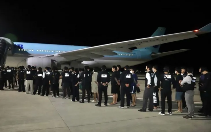Các công dân Hàn Quốc liên quan hoạt động lừa đảo sử dụng công nghệ được bàn giao tại sân bay quốc tế ở thủ đô Phnom Penh, Campuchia (Ảnh: AKP)