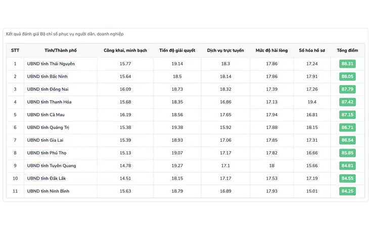Theo kết quả đánh giá mới nhất từ Cổng Dịch vụ công Quốc gia đến ngày 15/9/2025, tỉnh Thái Nguyên đã chính thức vươn lên vị trí dẫn đầu cả nước về Bộ Chỉ số phục vụ người dân, doanh nghiệp trong thực hiện thủ tục hành chính (TTHC), cung cấp dịch vụ công. Tỉnh Thái Nguyên đã xuất sắc giành vị trí quán quân trong số 34 tỉnh, thành phố được đánh giá với tổng điểm 88.31. Kết quả này đã đưa Thái Nguyên vượt qua nhiều địa phương luôn nằm trong top đầu.