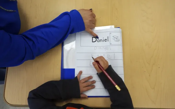 Một trợ lý giảng dạy chương trình Head Start đang giúp một học sinh luyện viết tên mình (Ảnh: AP)