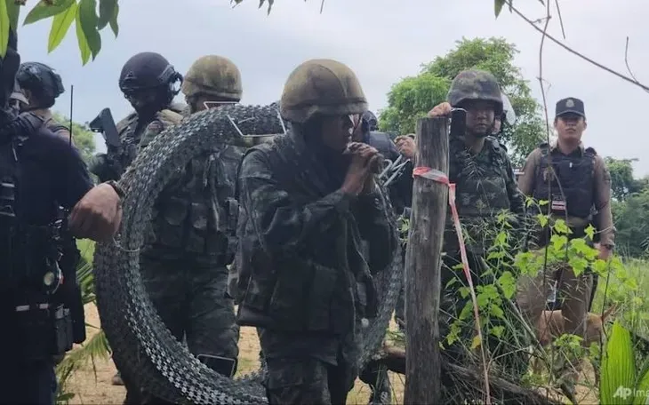 Binh sĩ Thái Lan mang theo hàng rào thép gai tại làng Prey Chan, khu vực biên giới tranh chấp với Campuchia ngày 17/9/2025 (Ảnh: AKP/AP)