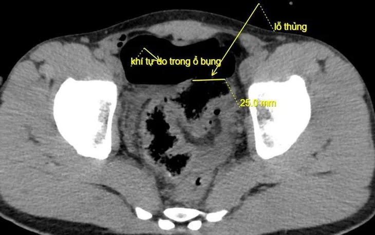 Kết quả chụp CT ổ bụng cho thấy nhiều khí tự do trong ổ bụng, nghi ngờ thủng tạng rỗng. Bệnh nhân được chỉ định mổ cấp cứu ngay. Trong quá trình phẫu thuật, ekip phát hiện đại tràng sigma thủng 2cm, dập nát quanh vùng tổn thương, có máu và dịch bẩn trong ổ bụng. Các bác sĩ đã tiến hành cắt lọc, khâu phục hồi đại tràng, rửa ổ bụng và dẫn lưu. Hiện bệnh nhân tỉnh, bụng mềm, trung tiện được, sức khỏe ổn định.