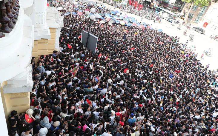 Quá đông người đến Nhà hát Lớn Hà Nội nhận vé trong sáng 20/8, BTC phải thông báo tạm dừng phát vé (Ảnh: Xuân Trần)