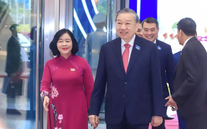 Tổng Bí thư Tô Lâm và các đại biểu đến dự Đại hội Đại biểu Đảng bộ TP Hà Nội lần thứ XVIII. Ảnh: VGP