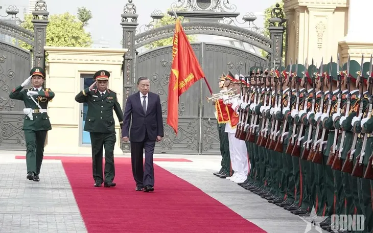 Đại tướng Phan Văn Giang, Ủy viên Bộ Chính trị, Phó bí thư Quân ủy Trung ương, Bộ trưởng Bộ Quốc phòng cùng các đồng chí lãnh đạo Bộ Quốc phòng đón Tổng Bí thư Tô Lâm. Ảnh: Báo QĐND