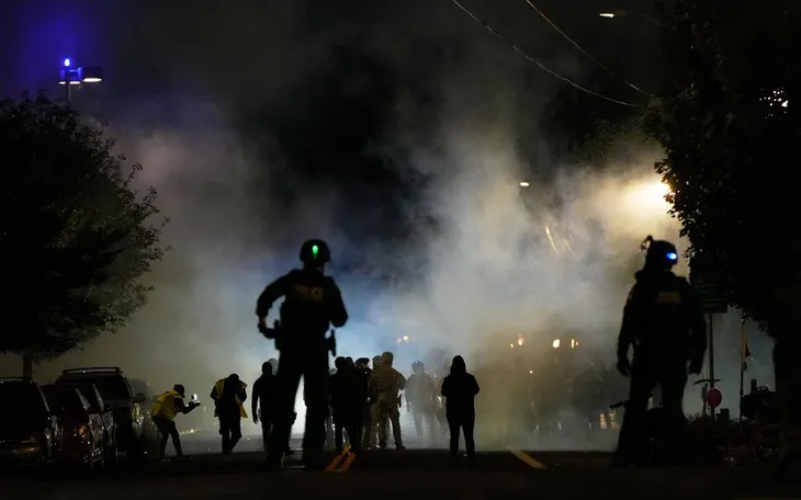 Cảnh sát triển khai hơi cay bên ngoài cơ sở của Cơ quan Di trú và Hải quan Mỹ trong cuộc biểu tình tại Portland, bang Oregon, ngày 4/10/2025 (Ảnh: AP)