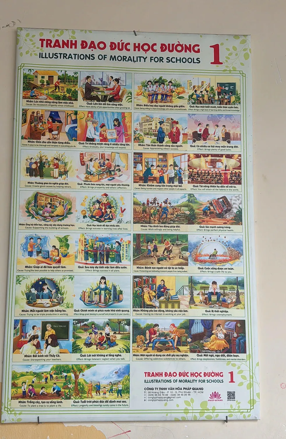 Trong tranh thể hiện nhiều câu có ý răn dạy đạo đức cho học sinh. Mỗi một bức tranh nhỏ được ghi chú phía dưới là việc "nhân" như thế nào, bên cạnh sẽ nhận lại "quả" như thế đó.