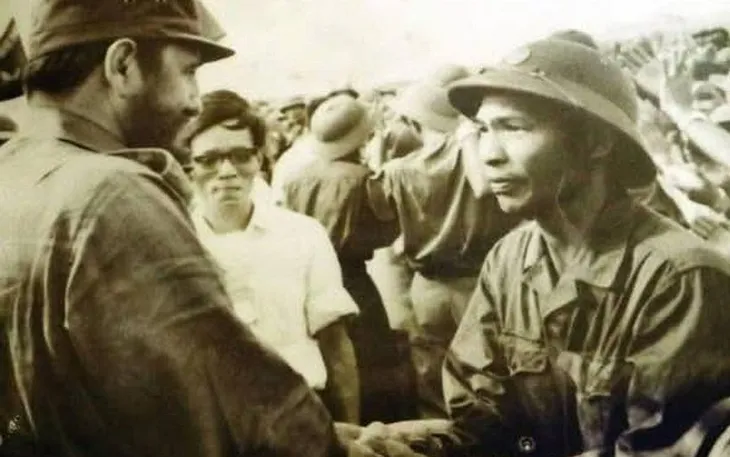 Đồng chí Nguyễn Đức Huy (bên phải) vinh dự được gặp Chủ tịch Cu Ba Fidel Castro tại chiến trường Quảng Trị năm 1973 (Ảnh tư liệu)