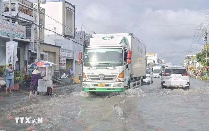 Các phương tiện giao thông di chuyển chậm trên tuyến đường ngập sâu. (Ảnh: Chanh Đa/TTXVN)