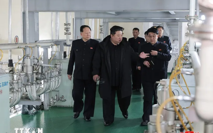 Nhà lãnh đạo Triều Tiên Kim Jong-un thị sát một cơ sở sản xuất vật liệu hạt nhân (Ảnh: KCNA/TTXVN)