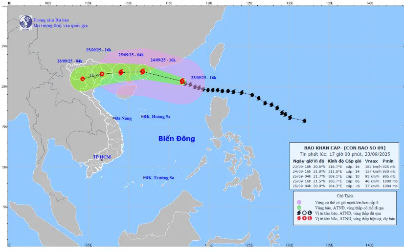 Theo Phó Giáo sư, Tiến sĩ, Giám đốc Trung tâm Dự báo khí tượng thủy văn Quốc gia, Cục Khí tượng thủy văn, Bộ Nông nghiệp và Môi trường: Bão số 9 còn duy trì cường độ mạnh cấp 15-16 trong khoảng thời gian từ nay đến sáng ngày 24/9; từ sáng ngày 24/9 khi di chuyển tới vùng biển phía Nam tỉnh Quảng Đông (Trung Quốc), có sự ma sát với địa hình, cộng thêm dòng không khí khô của không khí lạnh từ phía Bắc di chuyển xuống, xâm nhập vào vùng tâm bão, cường độ bão sẽ giảm cấp, từ cấp 16 xuống còn cấp 11-12 khi di chuyển vào Vịnh Bắc Bộ. Mức độ giảm cấp cũng phù hợp với các dự báo quốc tế.