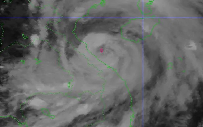 Vị trí tâm bão: Khoảng 17.6 độ Vĩ Bắc; 107.4 độ Kinh Đông, cách Bắc Quảng Trị khoảng 90km về phía Đông. Ảnh: TTKTTVQG