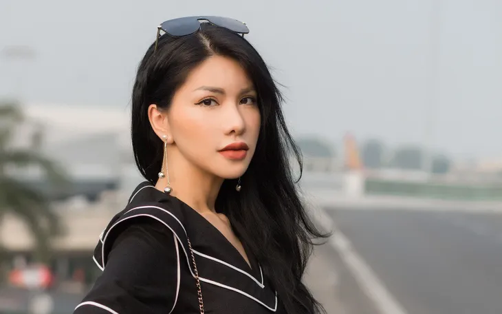Xuất hiện tại sân bay, Loan Vương thu hút sự chú ý của mọi người xung quanh khi diện bộ trang phục thiết kế đơn giản nhưng tinh tế, sang trọng và không kém phần gợi cảm của NTK Nguyễn Minh Công.