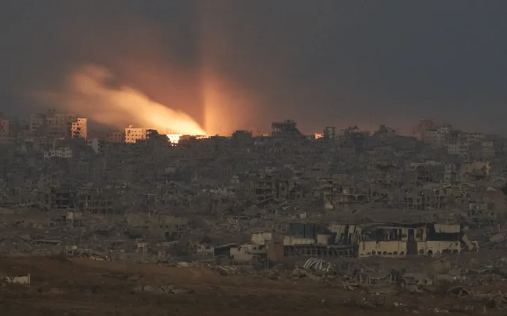Khói lửa bốc lên giữa các tòa nhà bị phá hủy sau cuộc không kích của Israel ở phía Bắc Dải Gaza, nhìn từ miền Nam Israel, ngày 6/10/2025 (Ảnh: AP)